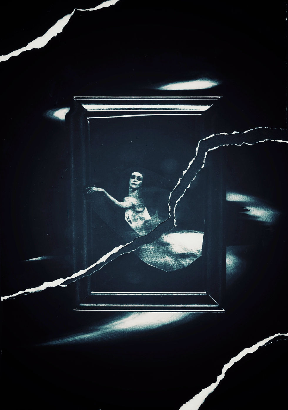 Description - Using various layering and scanning techniques, along with tearing the printed paper, I've created this photo collage depicting a woman torn in half, trapped behind the glass of a picture frame with one hand reaching out. Edited both by hand and in Snapseed on my mobile device for color.